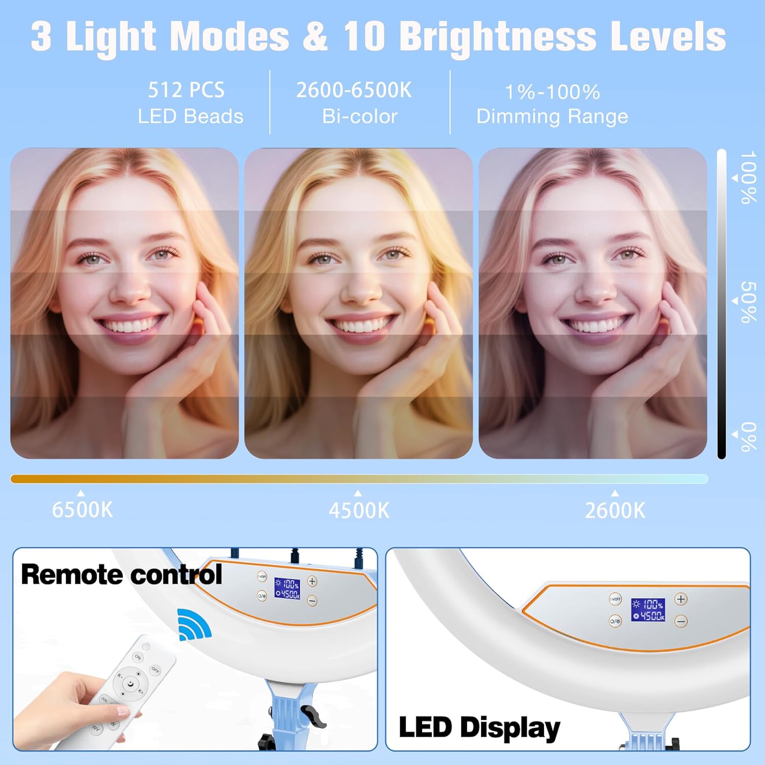 ENT가 포함된 22인치 링 조명은 따뜻한 노란색에서 차가운 흰색(2700k-4500kk-6500k)까지 1%에서 100%까지 밝기를 조절할 수 있습니다.